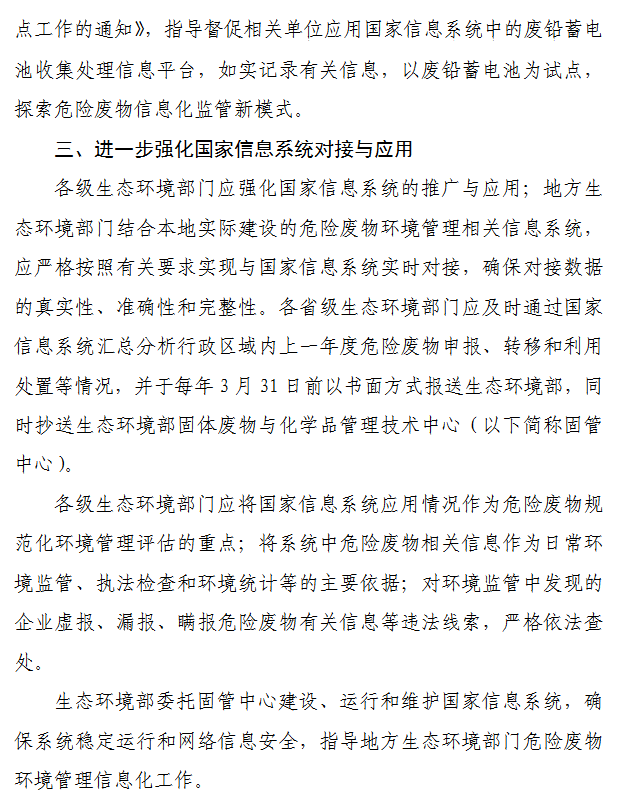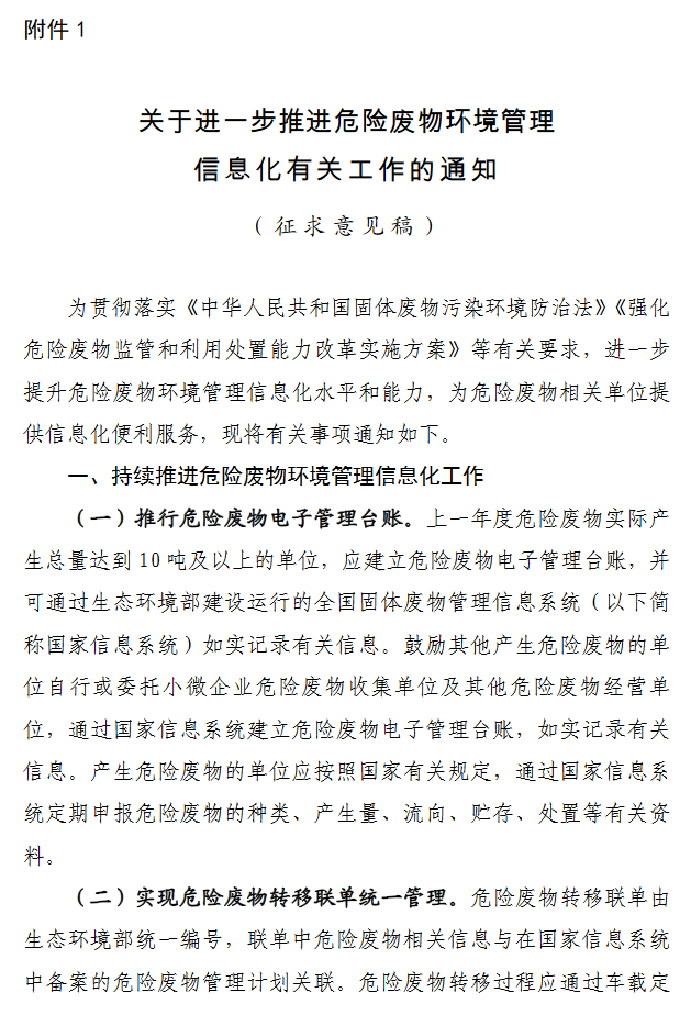 為貫徹落實《中華人民共和國固體廢物污染環(huán)境防治法》《強化危險廢物監(jiān)管和利用處置能力改革實施方案》等有關要求,進一步提升危險廢物環(huán)境管理信息化水平和能力,為危險廢物相關單位提供信息化便利服務,生態(tài)環(huán)境部辦公廳研究起草了《關于進一步推進危險廢物環(huán)境管理信息化有關工作的通知(征求意見稿)》。讓我們來看一下有哪些內(nèi)容吧。