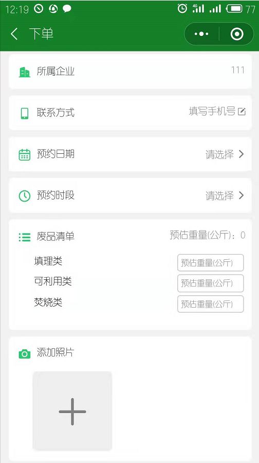 企業(yè)在廢品清單中選擇自己要清運的固體廢物,填入預估數(shù)值(單位噸/立方),有條件的企業(yè)可以自主過磅。最后拍照上傳完成預約下單。